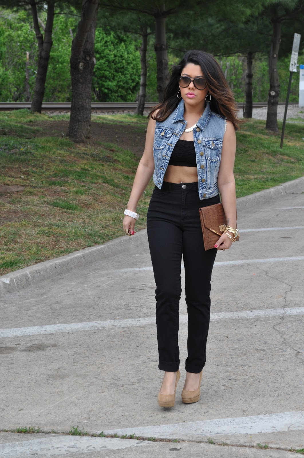 I wanted to show a little bit of stomach, but I didn't want to go overboard so I put on my semi high waisted black skinnies from H&M. To break up the black and throw in another color, I went with my Nine West tan suede pumps and used this oversized envelope clutch.