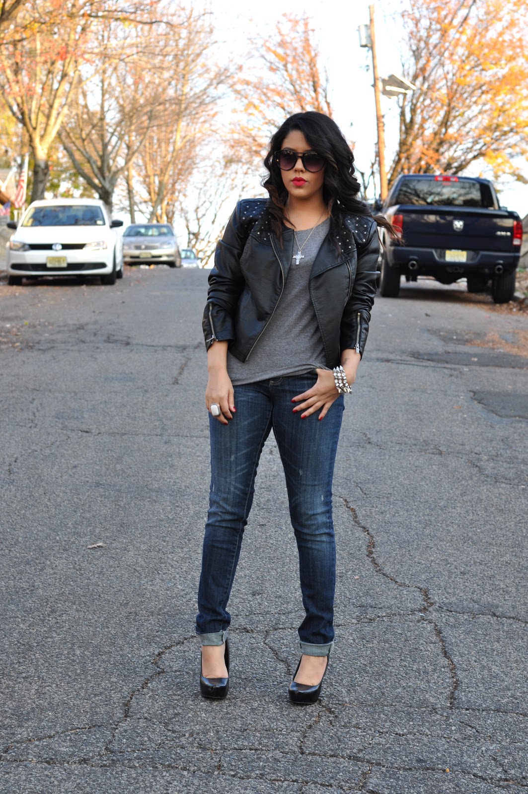 Leather jackets are all the rage this season! They are the perfect piece to add a little edge to any ensemble. I wanted to do something more casual and laid back with this outfit so I went with a dark pair of skinnies, simple tee, and heels. I really love the studded detail because it makes the jacket stand out more and easier to transition into a dressier look.